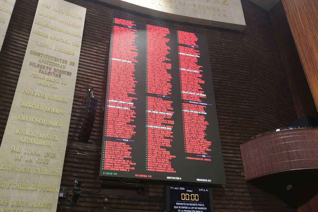El pleno de la Cámara de Diputados aprobó la Ley de Ingresos de la Federación para 2026 la cual prevé una captación total de 10 billones 193 mil 683 millones de pesos. En lo general obtuvo 349 votos a favor y 121 en contra, mientras que en lo particular la votación logró 352 votos a favor y 128 en contra.